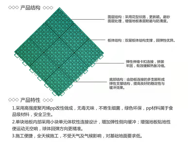 懸浮式運(yùn)動(dòng)拼接地板,也被稱(chēng)為組合式運(yùn)動(dòng)地板,是第四代體育運(yùn)動(dòng)地板的運(yùn)動(dòng)場(chǎng)地面層材料。