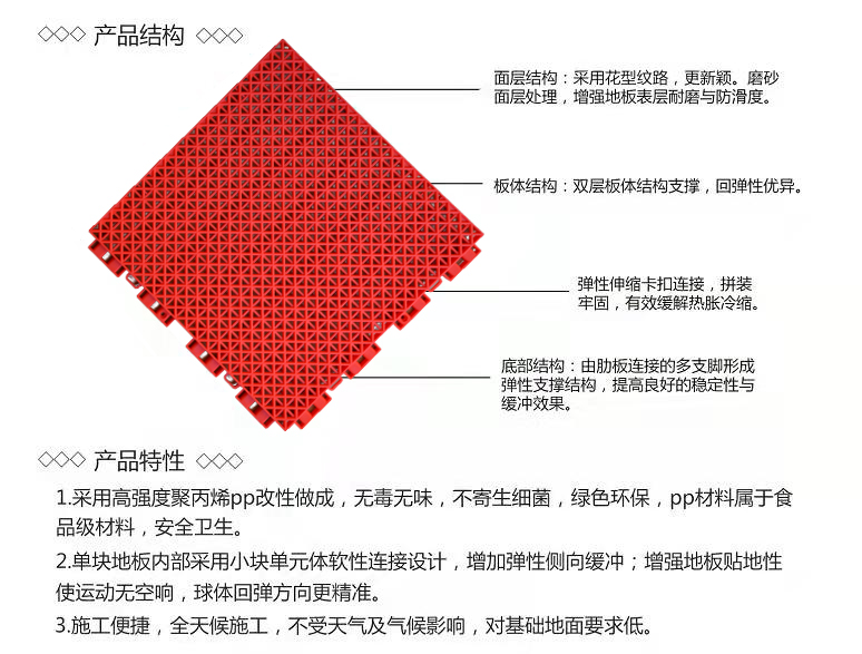 面層采用花型紋路,磨砂面層處理,增加地板表層耐磨和防滑度。板體結(jié)構(gòu),雙層板體結(jié)構(gòu),回彈優(yōu)異。底部結(jié)構(gòu),由肋板連接的多支腳形成彈性支撐結(jié)構(gòu),提高良好的穩(wěn)定性和緩沖效果。